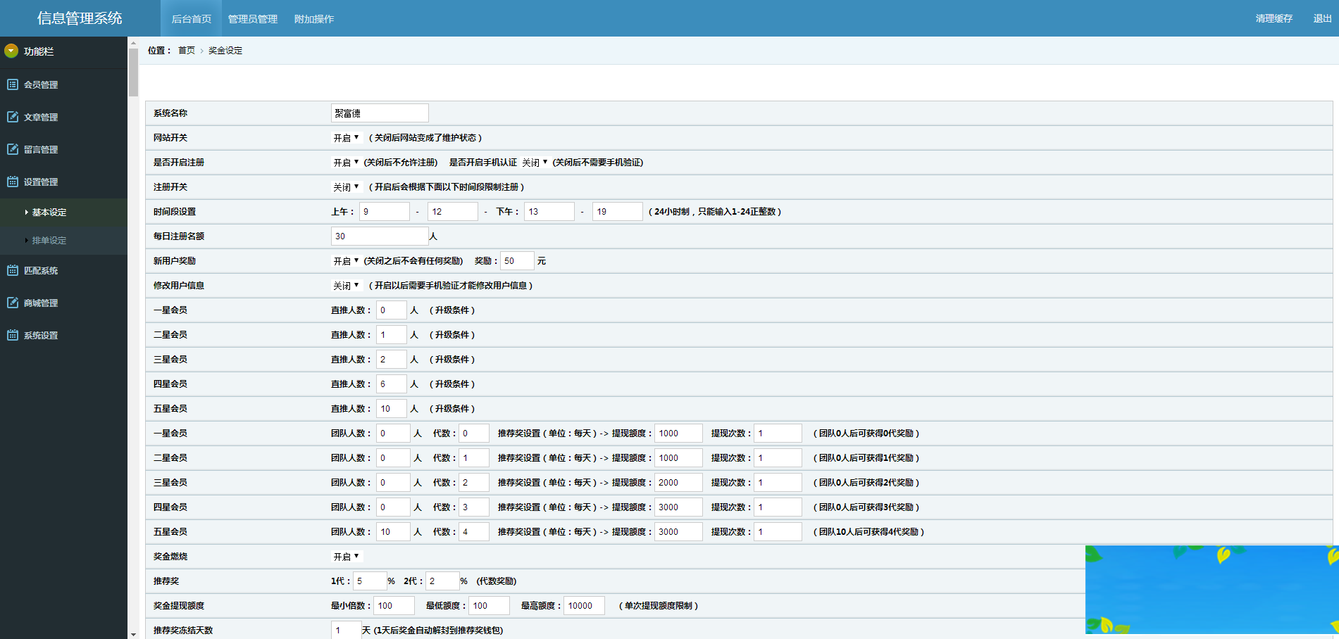 7,直推一代奖金的10%、二代奖金的20%作为商城维护费用及抽奖费用。