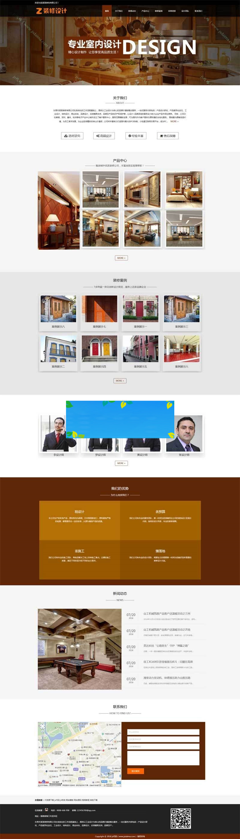 主要有: 关于我们、新闻动态、产品中心、装修案例、荣誉资质、设计团队、联系我们等模块页面。