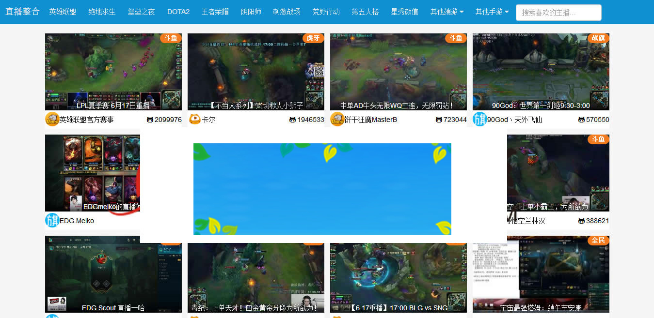 整合了虎牙、斗鱼、熊猫、战旗、全民、龙珠六大平台。