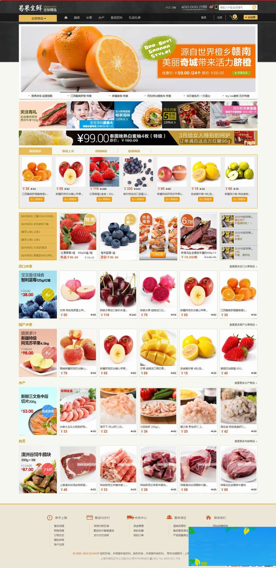 模板说明:ecshop模板堂易果网2014最新模板全网首发,一款时尚简洁的食品类模板。整站宽屏,页面右侧悬浮返回顶部、微信扫描,第三方登录,鼠标移入显示用户登录,左侧分类导航弹出等功能,首页幻灯 片下精品推荐、新品上市、热销商品、促销商品切换,商品从下往上循环滚动最新评论,购物流程一目了然,其他页面新增多种jquery兼容特效,整站采用 Div+Css布局,兼容良好,网页打开速度快!