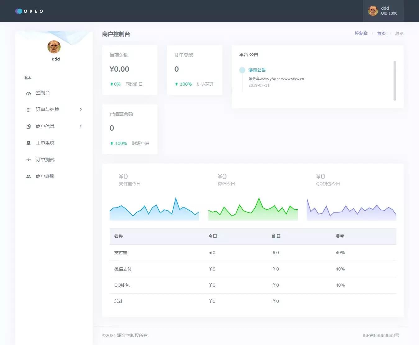 集合了微信官方+支付宝官方+易商户+码支付+易通商户+网信钱包免签即时到账接口,让个人用户也能用上好用的易支付商户系统,系统自带10套基础模板。