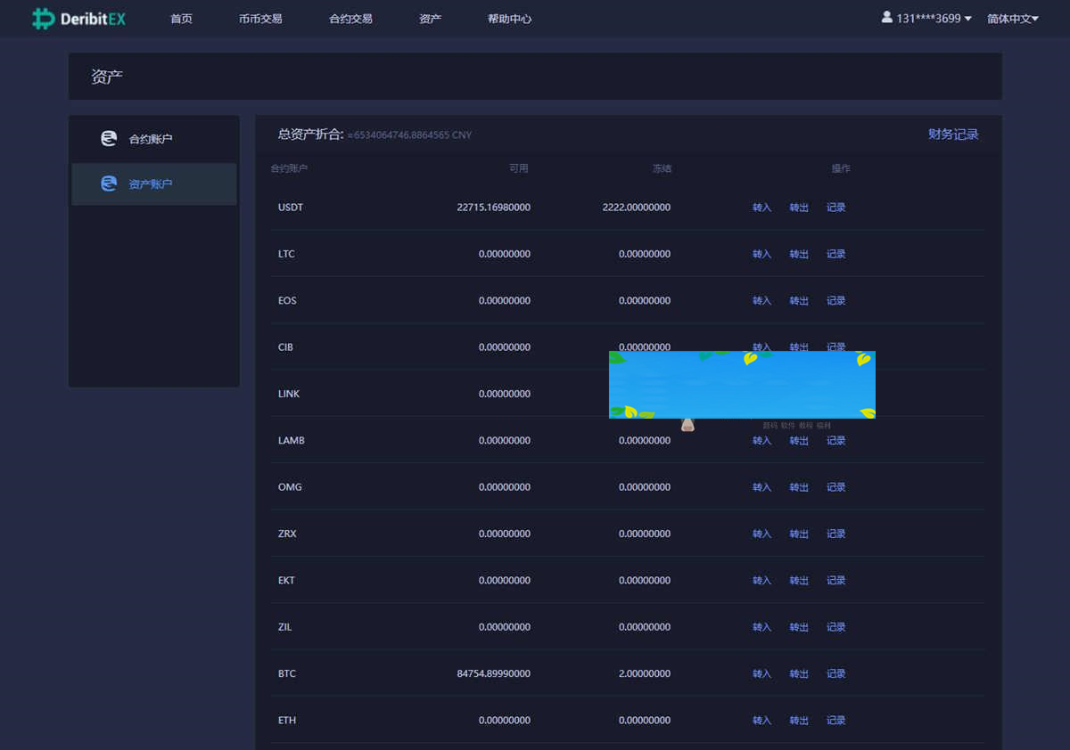 资产页面包含总资产的所持各个币种的资产。