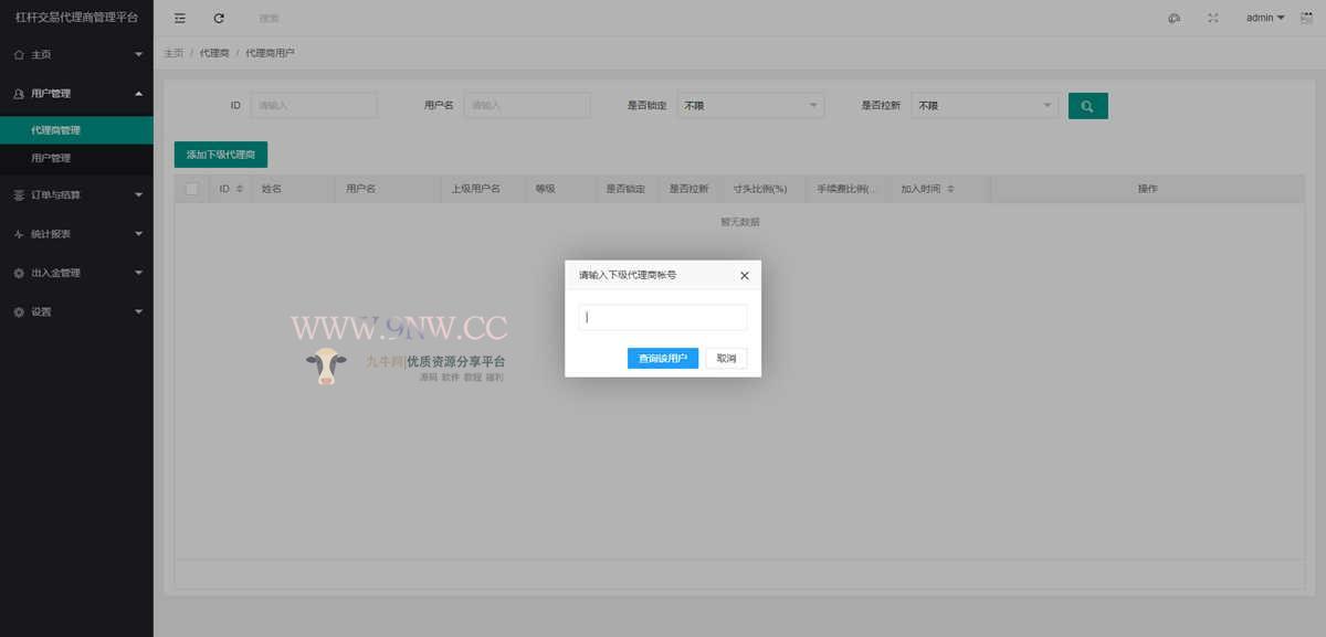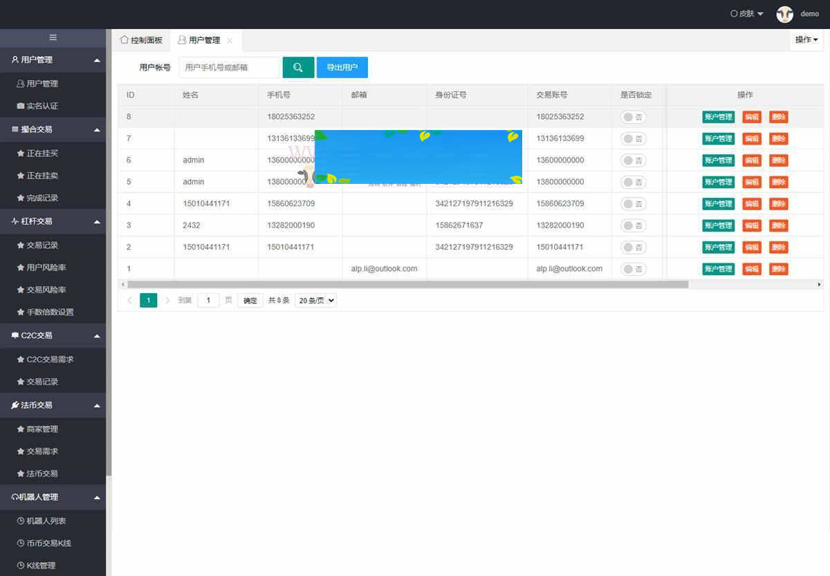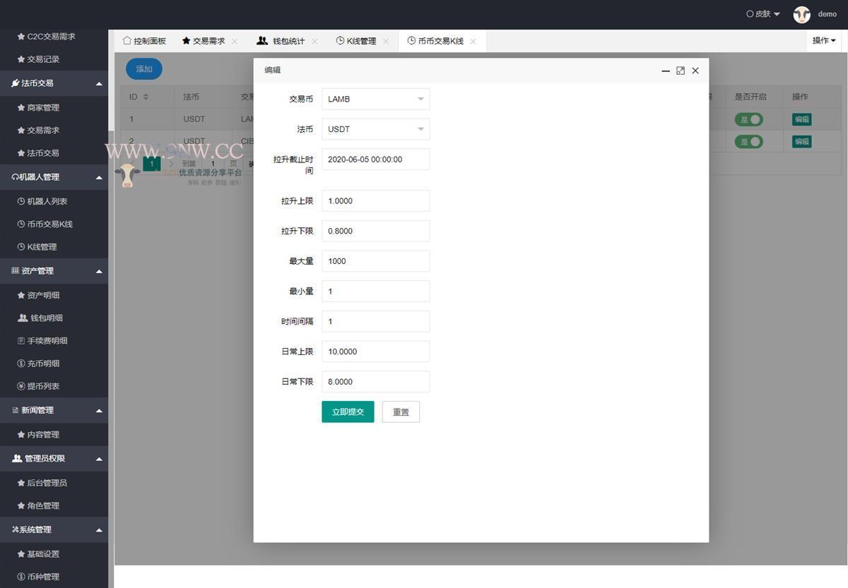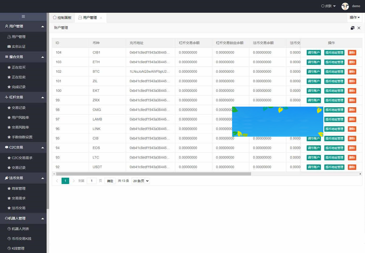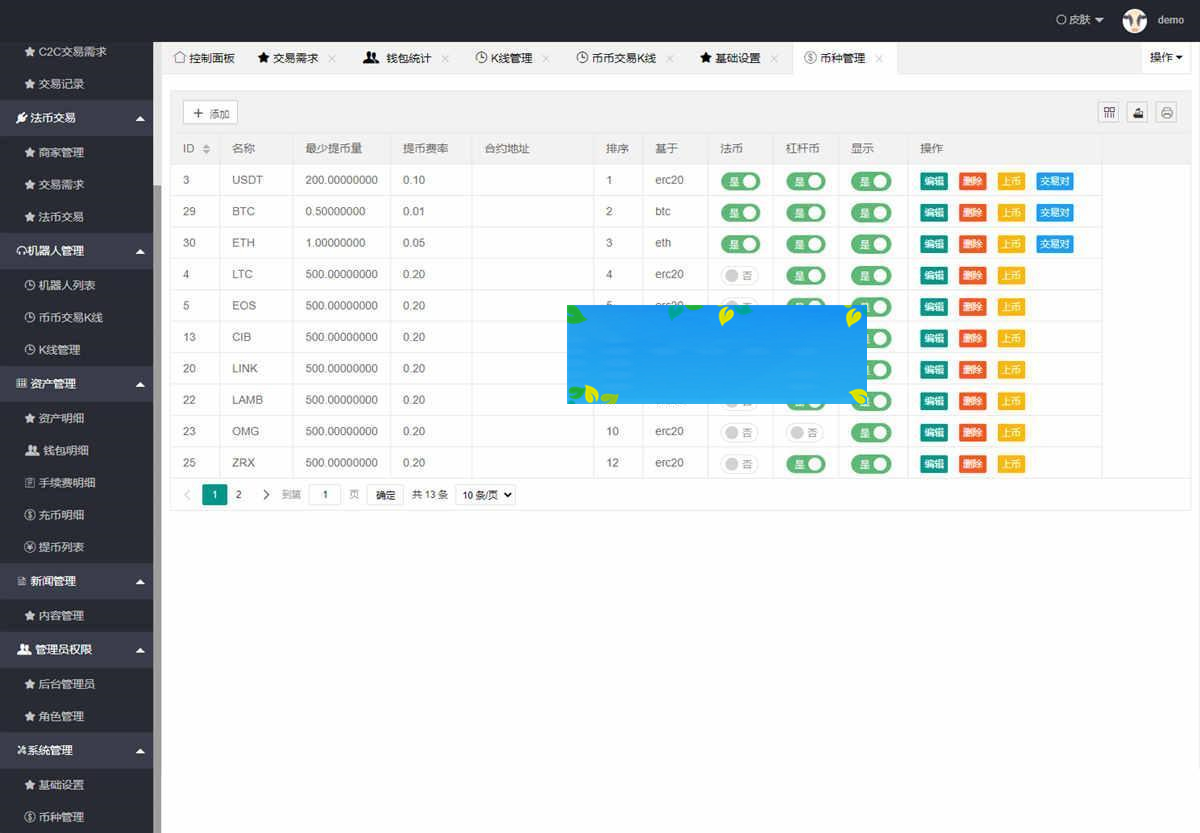 后台可对用户、代理商、钱包、资产、手续费等各个方面进行编辑。