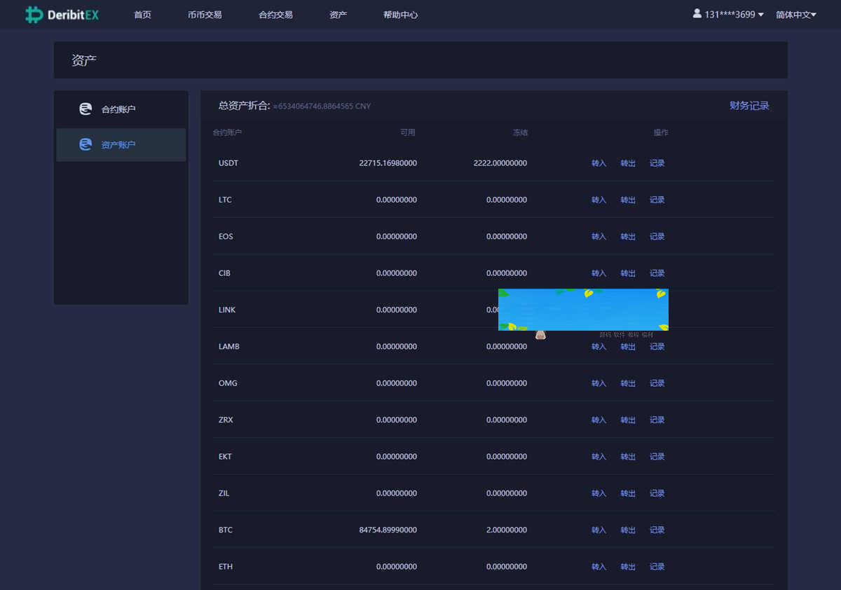 资产页面包含总资产的所持各个币种的资产。