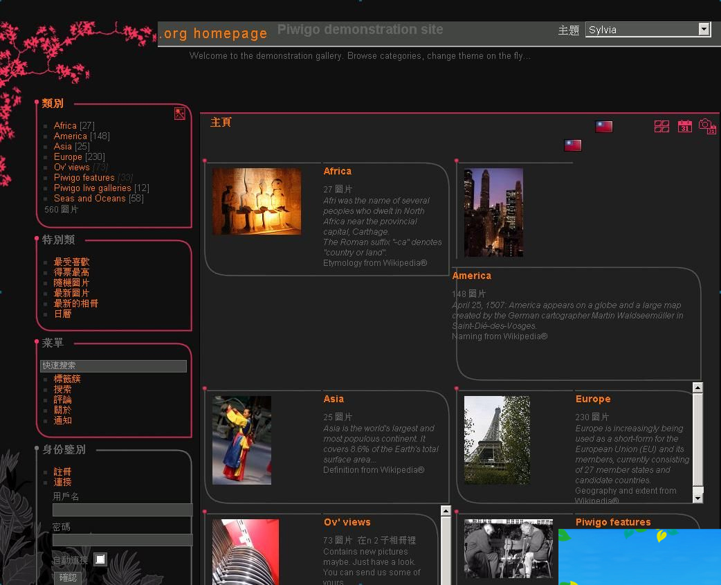 Piwigo是一个基于MySQL5与PHP5开发的相册系统。提供基本的发布和管理照片功能,按多种方式浏览如类别,标签,时间等。