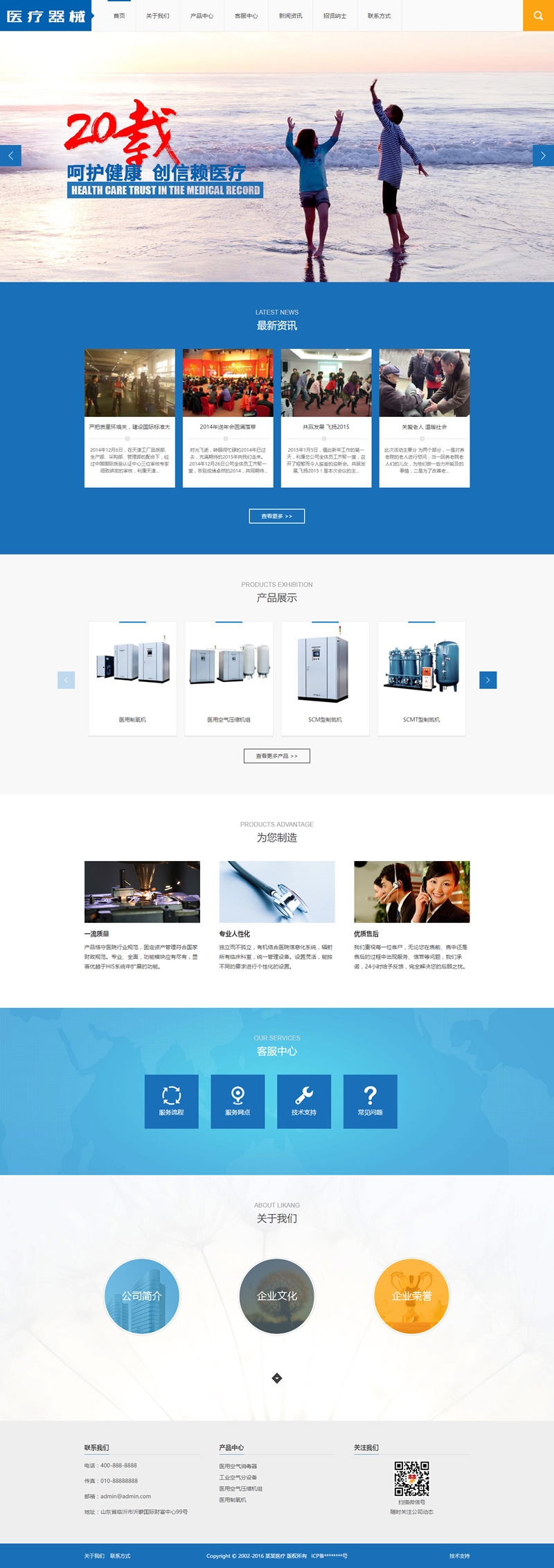 一款蓝色大气的医疗器械类,医疗健康设备,医用设备生产销售公司网站织梦模板dedecms下载。包含:关于我们、产品中心、医用空气消毒器、工业空气分设备、医用空气压缩机组、医用制氧机、客服中心、新闻资讯、招贤纳士、联系方式等模块页面。