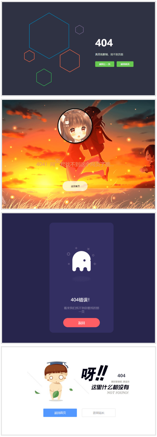 喜欢哪款就修改哪款的index.html文件里面的内容,直接上传404页面即可使用。