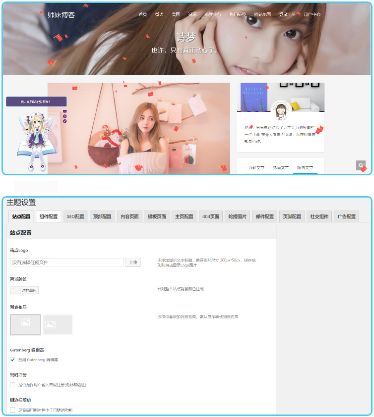 可设置seo关键字及站点描述页面伪静态,自定义的顶部样式(背景图 ),支持图片轮播、侧边栏文章聚合、广告栏、点赞和社交化分享等功能,以及漂亮的博客订阅功能组件,让你的个人博客更加与众不同。