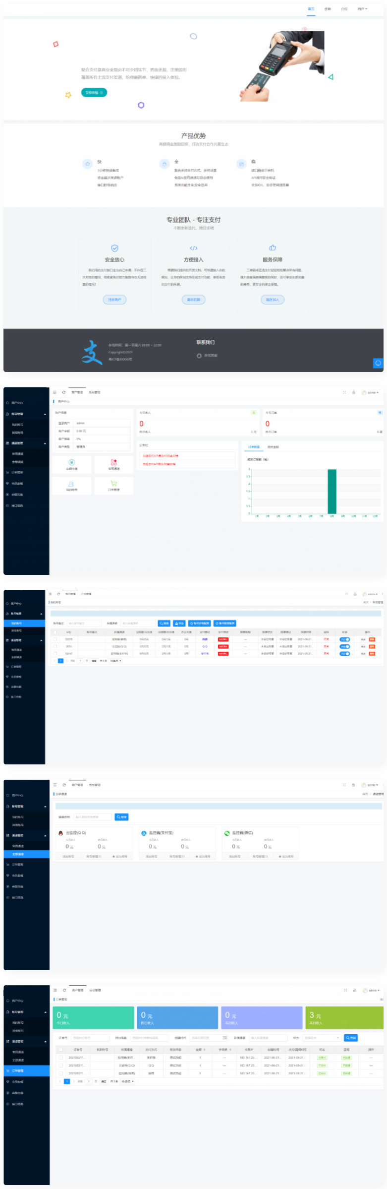 此免签码支付系统,兼容易支付接口,系统为多商户管理,商户额度控制 充值额度设置 订单时间设置 商户购买套餐设置 注册设置 域名设置(单独通道域名) 公告设置 商户通道管理等。