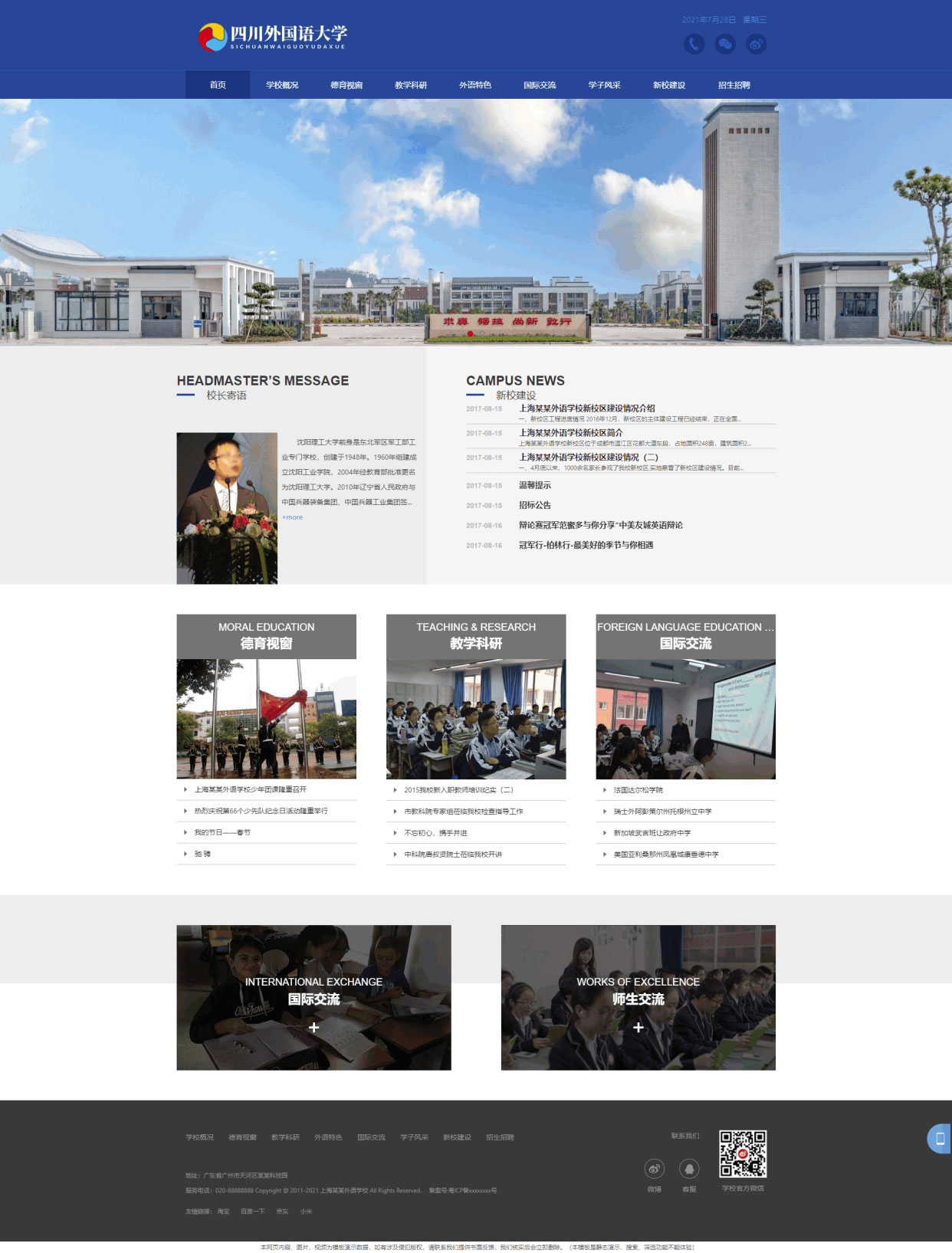 ThinkPHP5蓝色简洁响应式外国语大学学校学院教育网站源码 自适应手机端