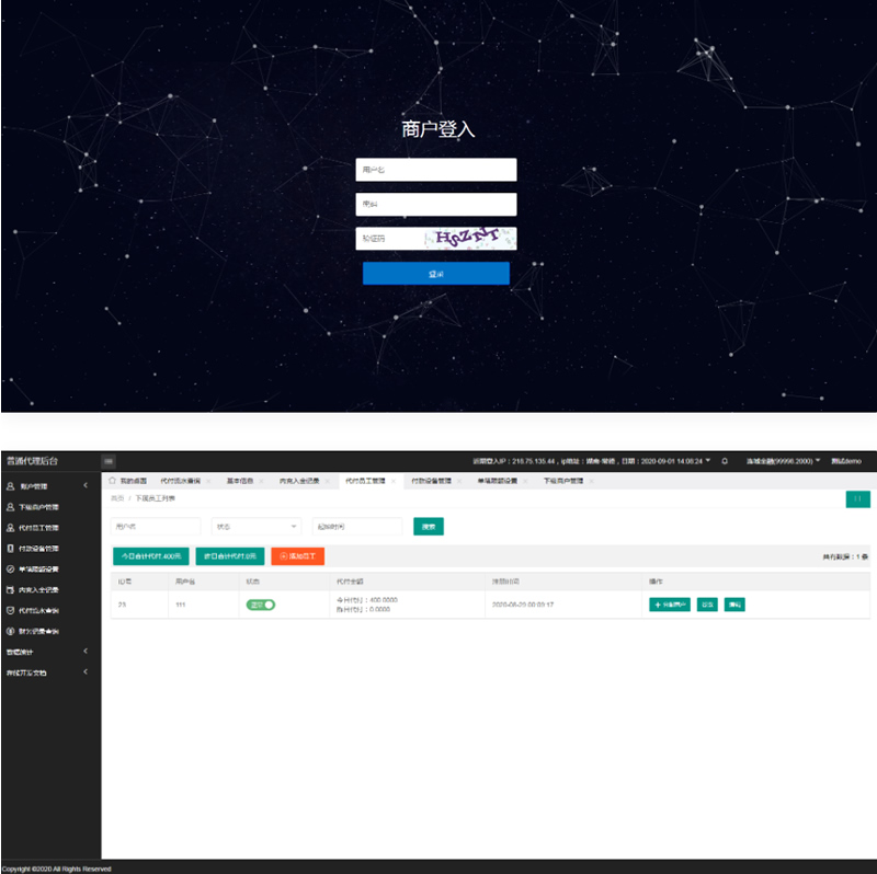 7:系统分为:后台-代理-代付员工-商户