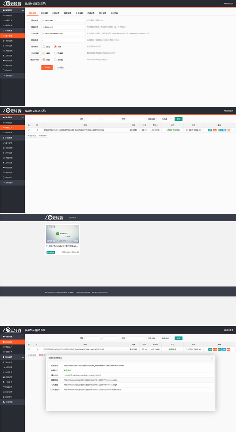 3、优化了代码,在开启双码率的情况下,可实现极速转码、切片。