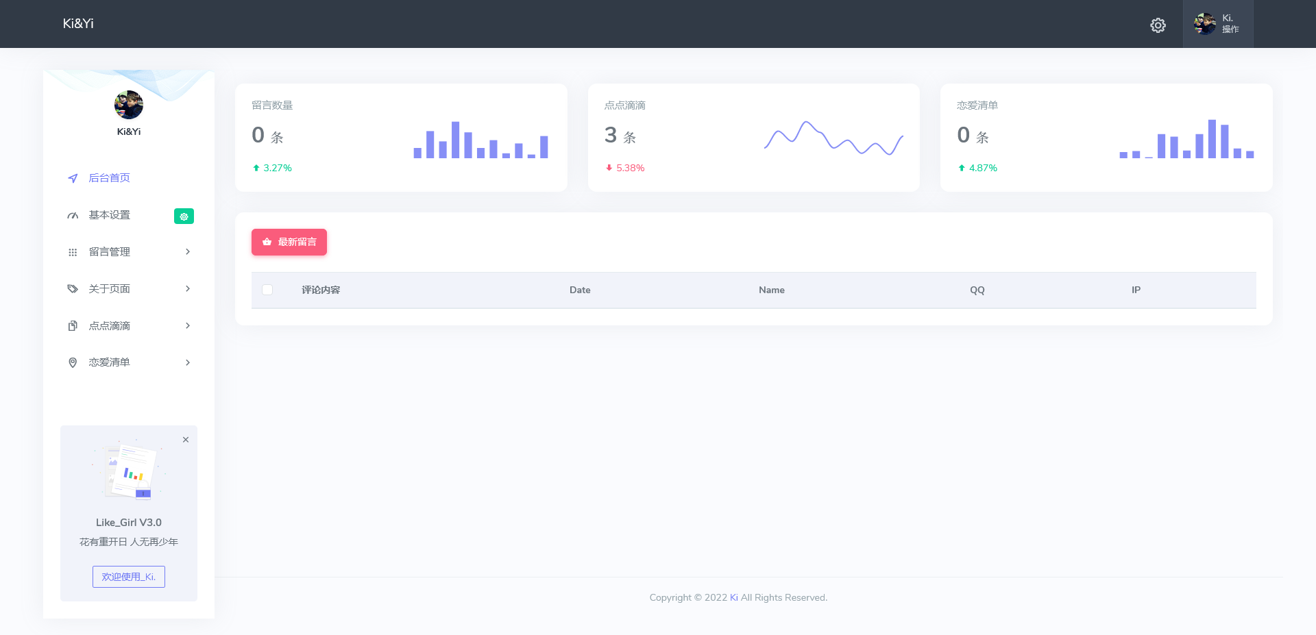 Like_Girl是我暑假假期剩下几天的时候写的基本功能 1.0-2.0版本是全原生css js 3.0引入后台模板 文章编辑器 图片灯箱等插件