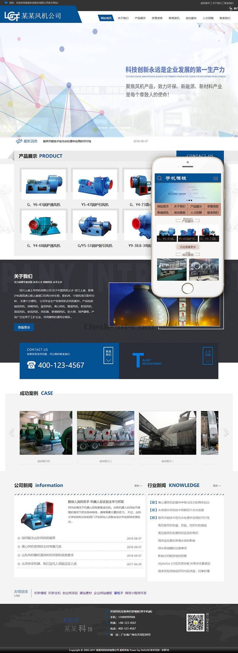 织梦最新内核开发的模板,该模板属于企业通用类、风机设备类企业都可使用,